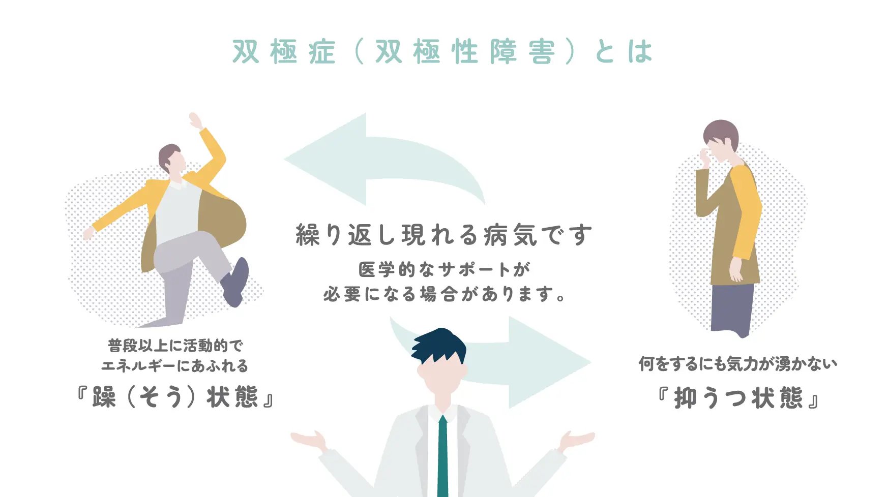 気分が自然に変わることは誰にでもありますが、双極症ではその変化が極端であり、医学的なサポートが必要になる場合があります。