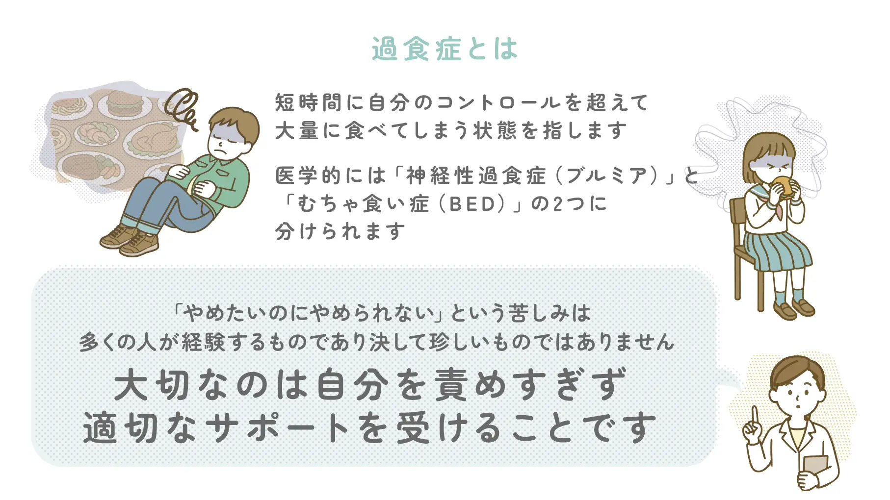 どちらも「ただ食べすぎてしまう」こととは異なり、強い衝動や心理的な要因が関与しており、れっきとした病気として医学的に認められています。