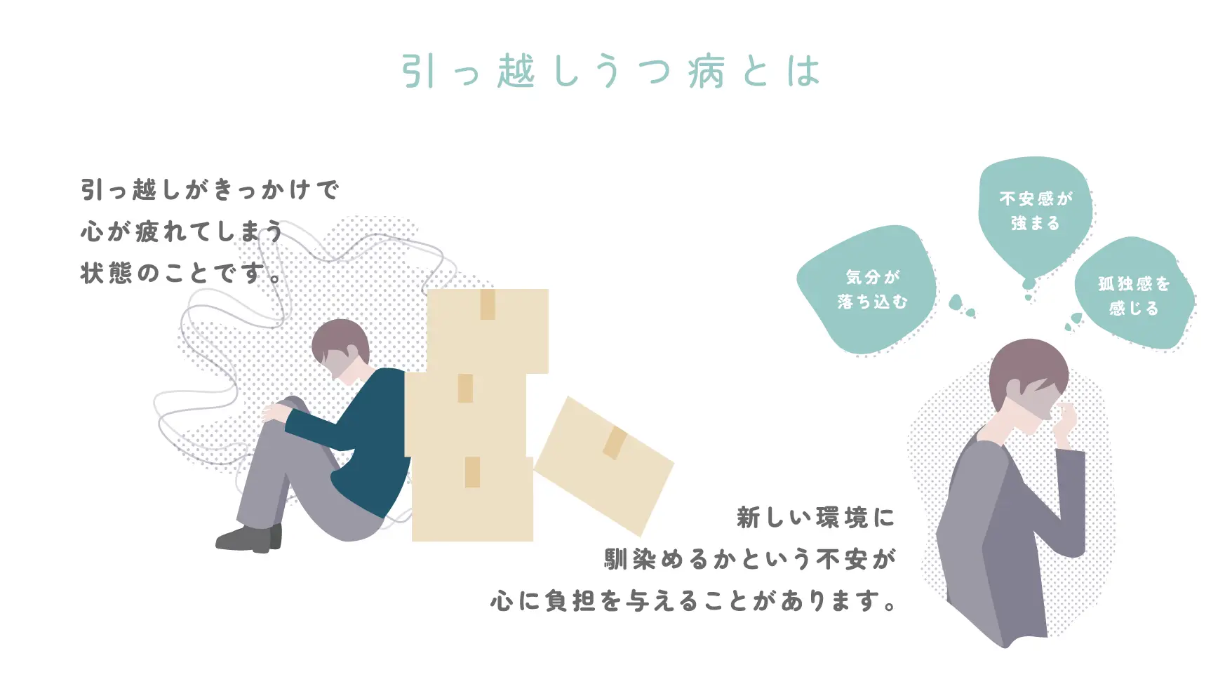 引っ越しうつ病は、引っ越しがきっかけで心に負担を感じる状態ですが、これは特別なことではなく、誰にでも起こりうることです。