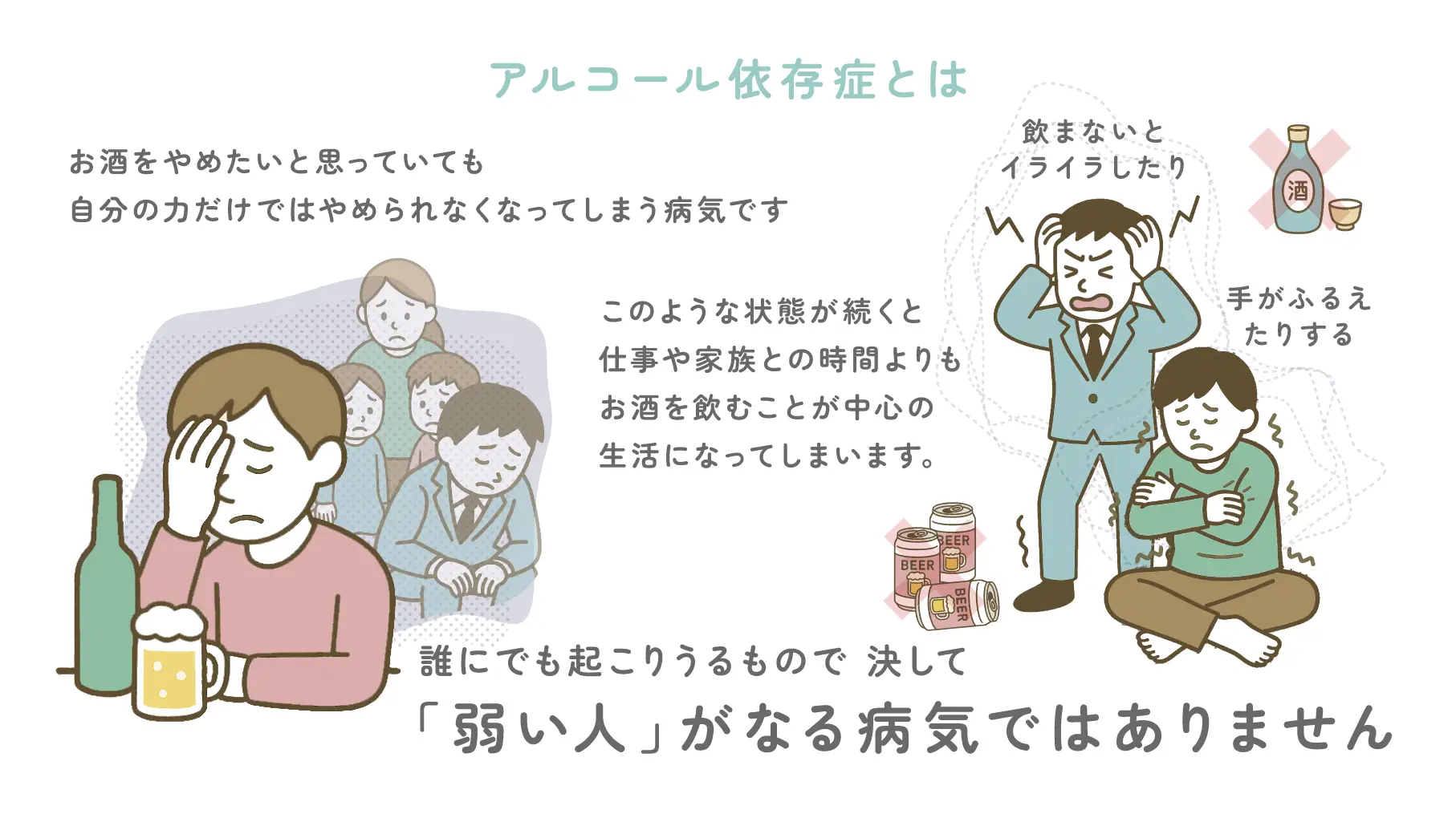 アルコール依存症とは、お酒をやめたいと思っていても、自分の力だけではやめられなくなってしまう病気です。