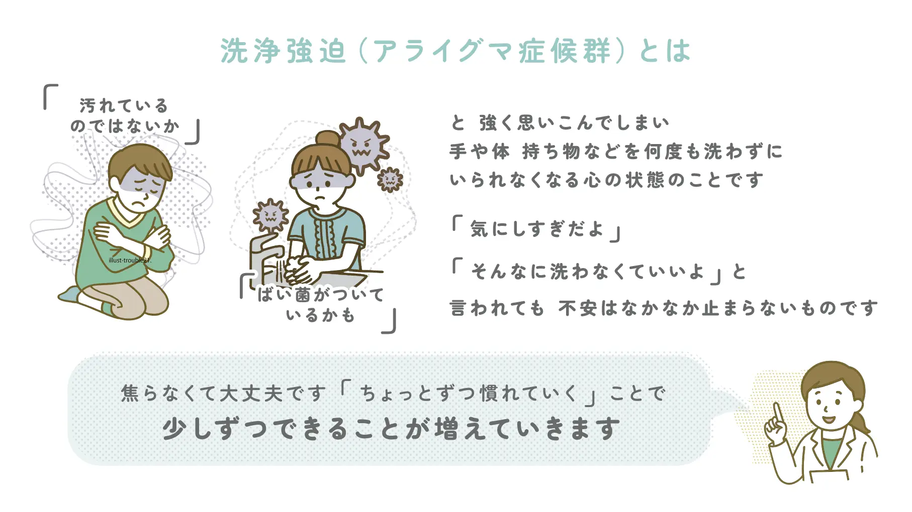 洗浄強迫(せんじょうきょうはく)は、「汚れているのではないか」「ばい菌がついているかも」と強く思いこんでしまい、手や体、持ち物などを何度も洗わずにいられなくなる心の状態のことです。