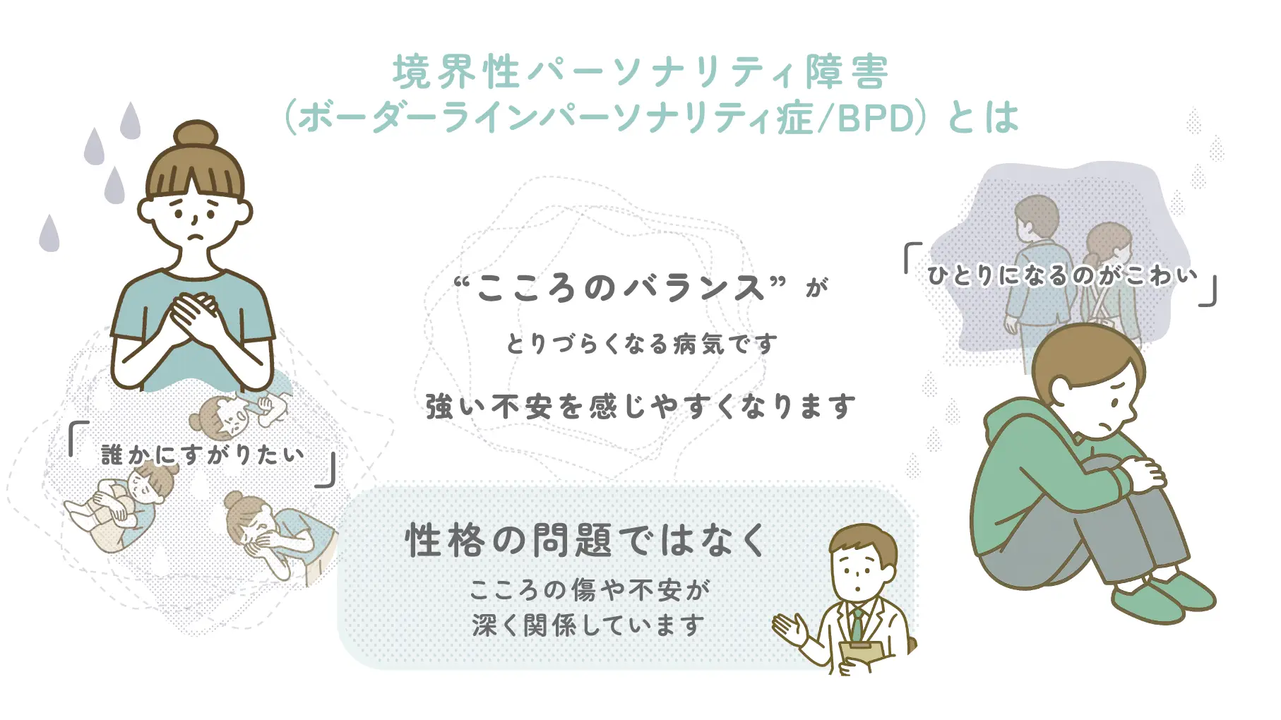 境界性パーソナリティ障害/ボーダーラインパーソナリティ症(BPD)は、「見捨てられる不安」や「感情のゆれ」によって、人との関係や自分自身への思いが不安定になるこころの病気です。