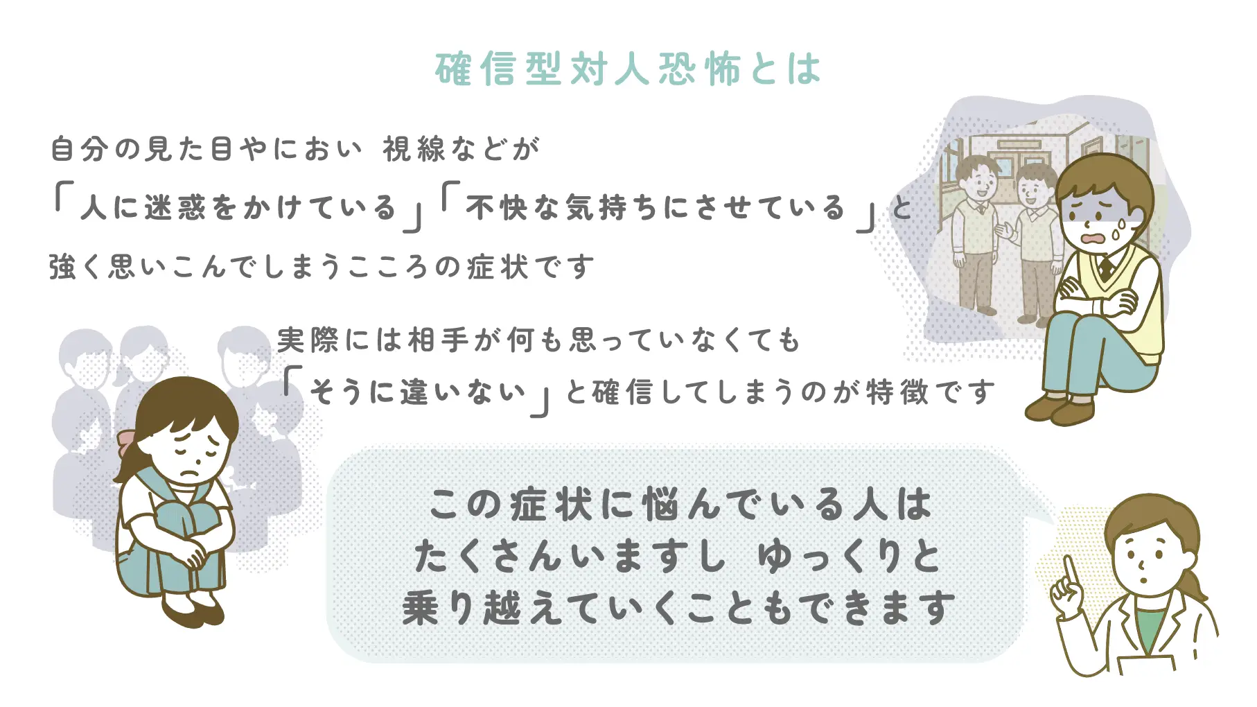 確信型対人恐怖(かくしんがたたいじんきょうふ)とは、自分の見た目やにおい、視線などが「人に迷惑をかけている」「不快な気持ちにさせている」と、強く思いこんでしまうこころの症状です。