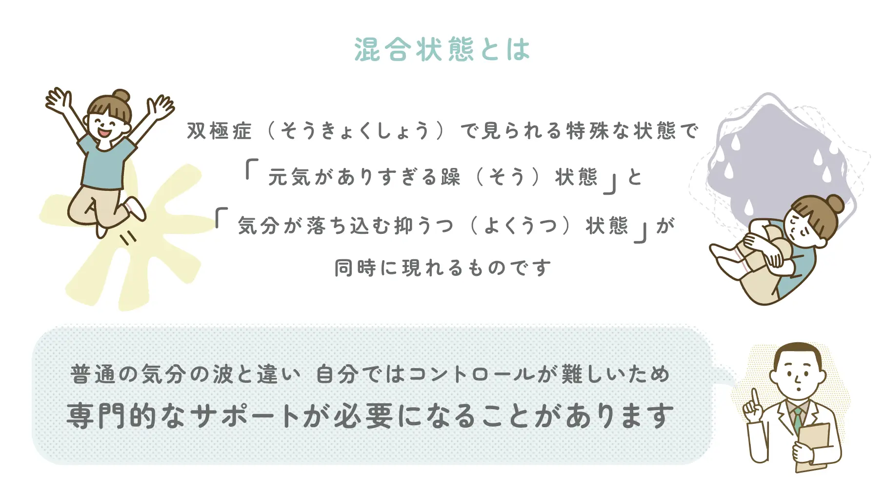 混合状態とは、双極症(そうきょくしょう)で見られる特殊な状態で、「元気がありすぎる躁(そう)状態」と「気分が落ち込む抑うつ(よくうつ)状態」が同時に現れるものです。