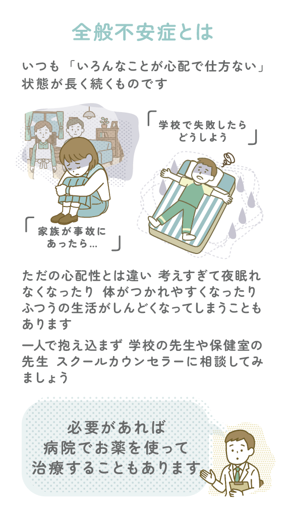 全般不安症は、まじめでがんばり屋さんな人や、まわりの気持ちにとても敏感な人によく見られます。