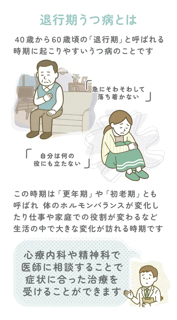 退行期うつ病は、40歳から60歳頃の人生の転機に起こりやすい病気ですが、適切な治療を受ければ改善できます。