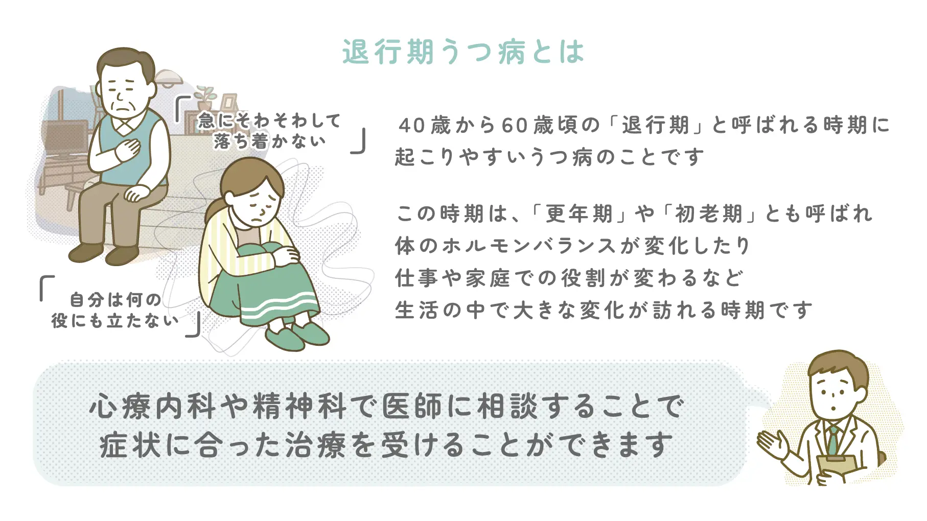 必要であれば心療内科や精神科で医師に相談することで、症状に合った治療を受けることができます。