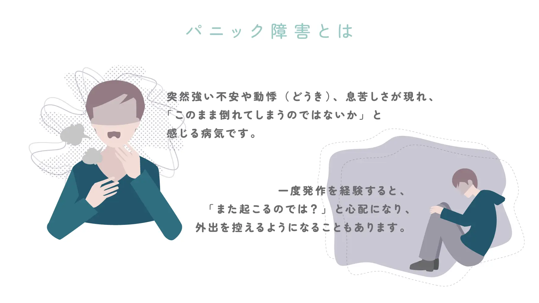 パニック障害は、突然の強い不安と体の症状が現れ、「また発作が起こるのでは」と不安になってしまう病気です。しかし、パニック発作は必ずおさまり、治療をすれば改善が期待できます。