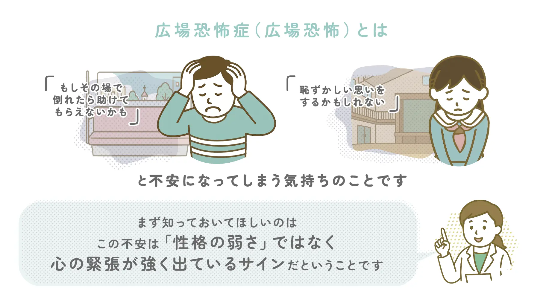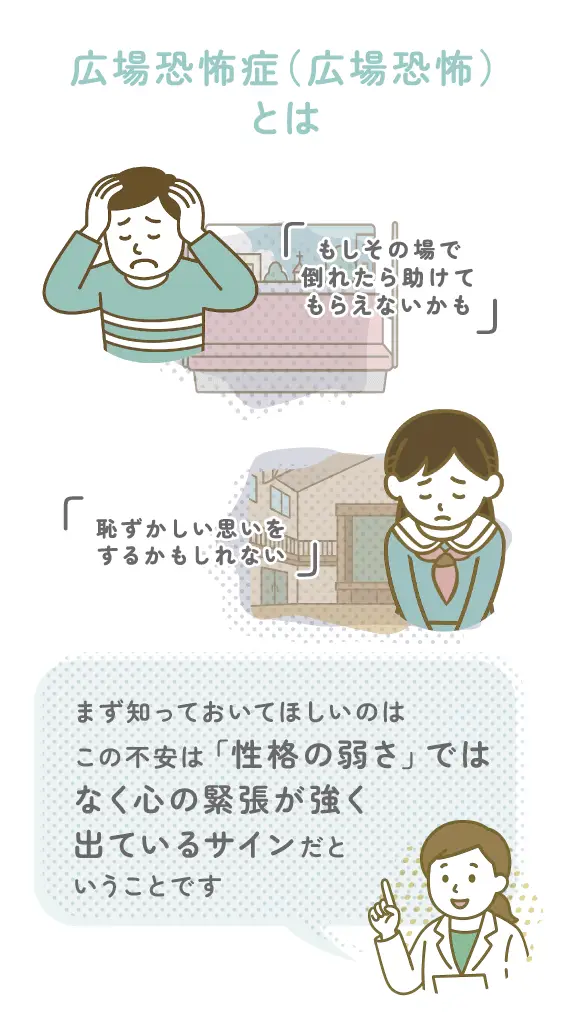 広場恐怖は、「もし何かあったらどうしよう…」という気持ちが強くなって、外出や人前がこわくなる心の状態です。