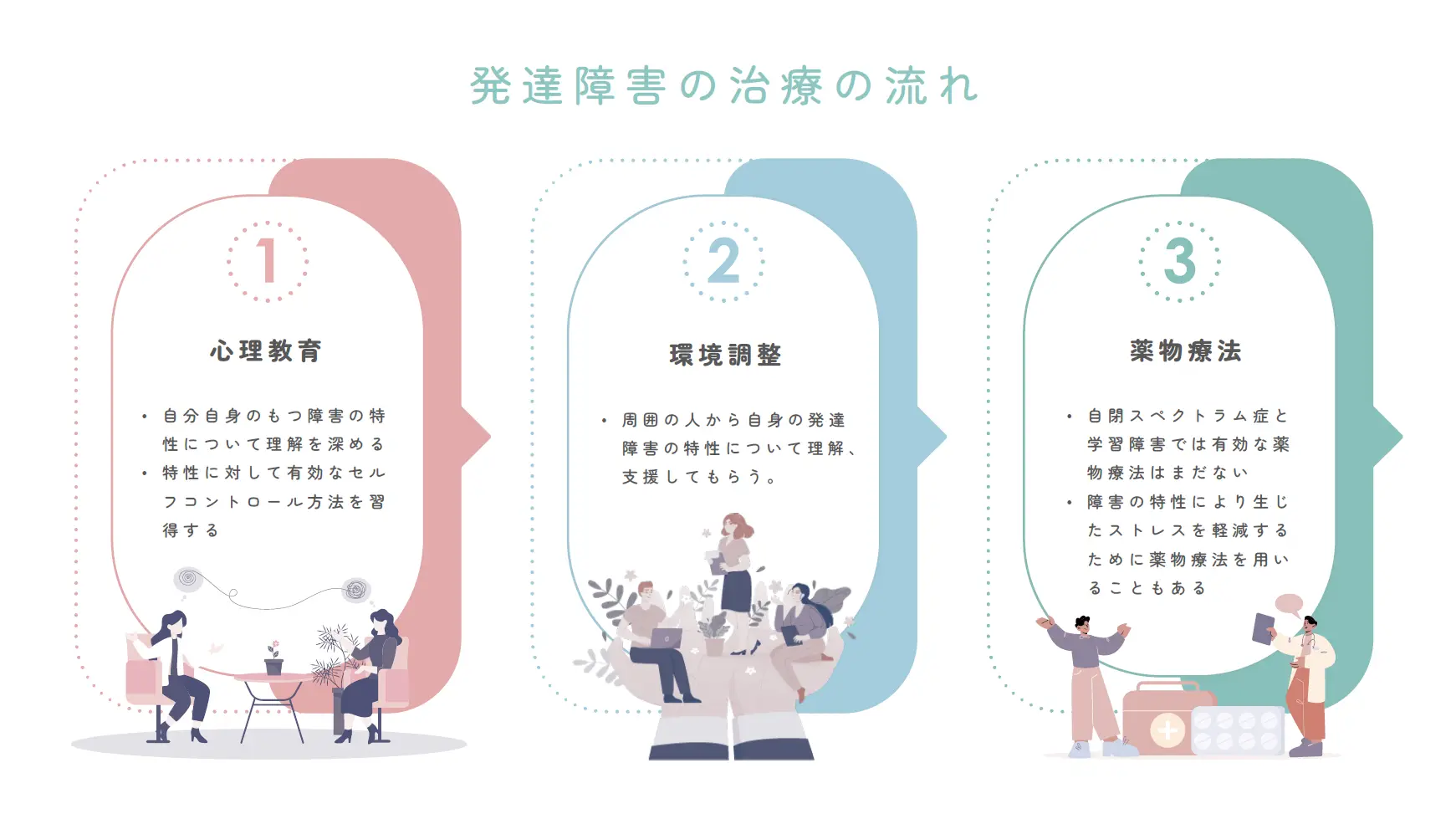 発達障害の治療方法は、「心理教育」「環境調整」「薬物療法」の3種類に分けられます。