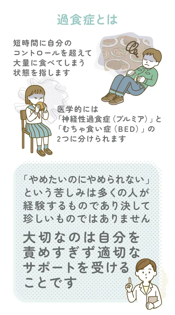 どちらも「ただ食べすぎてしまう」こととは異なり、強い衝動や心理的な要因が関与しており、れっきとした病気として医学的に認められています。