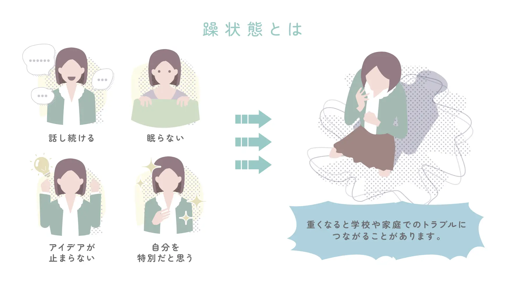 躁状態は、双極症という病気に関連して起こるため、この病気を持つ人がなりやすい状態です。