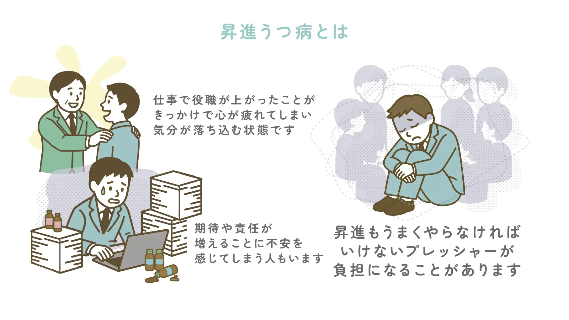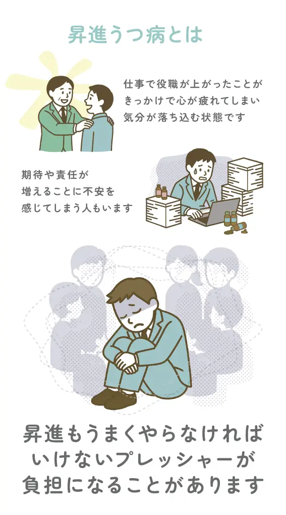 昇進うつ病とは、仕事で役職が上がったことがきっかけで心が疲れてしまい、気分が落ち込む状態のことです。