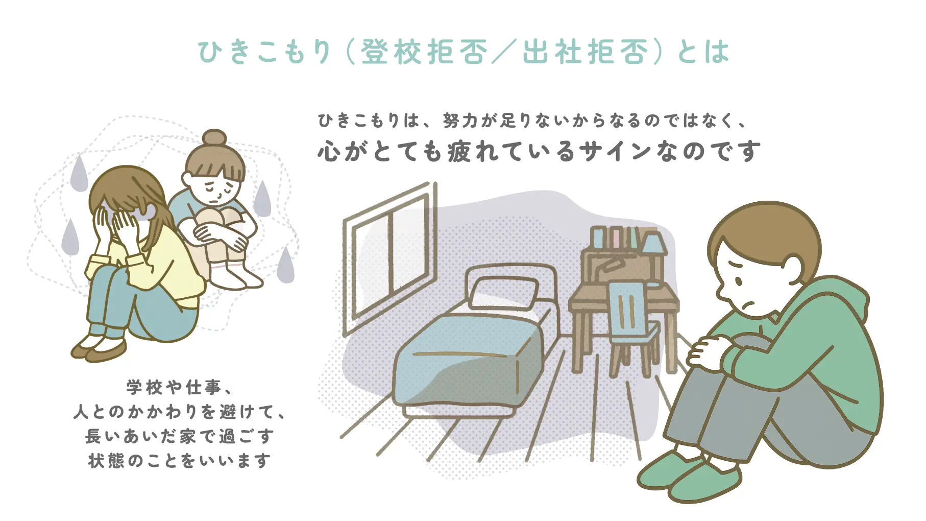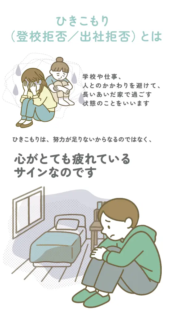 ひきこもりとは、学校や仕事、人とのかかわりを避けて、長いあいだ家で過ごす状態のことをいいます。