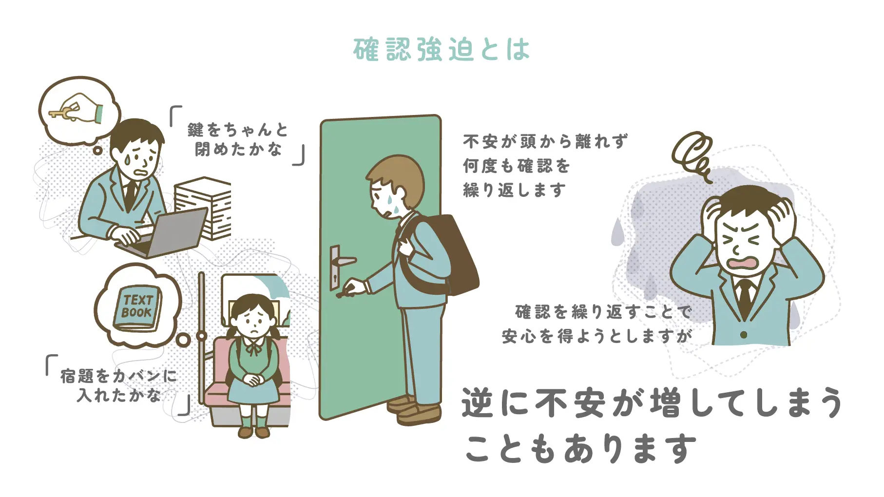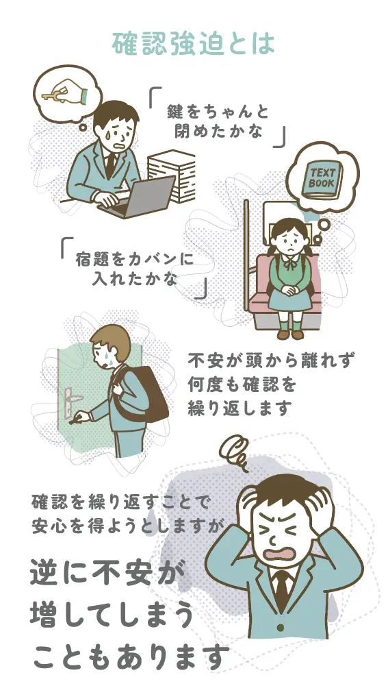 「鍵をちゃんと閉めたかな」「宿題をカバンに入れたかな」といった不安が頭から離れず、何度も確認を繰り返します。