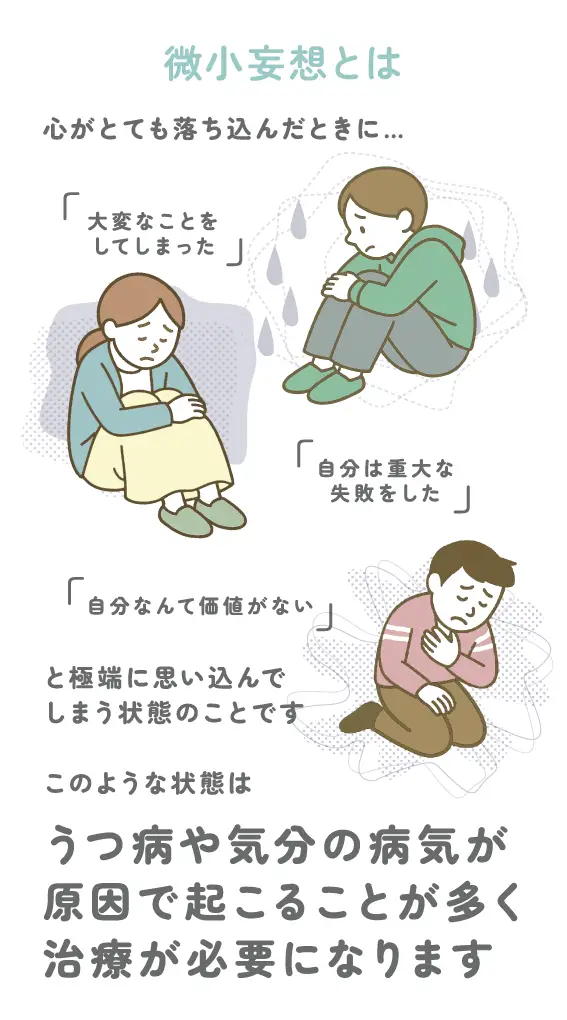 微小妄想とは、心がとても落ち込んだときに、「自分なんて価値がない」とか「大変なことをしてしまった」と極端に思い込んでしまう状態のことです。