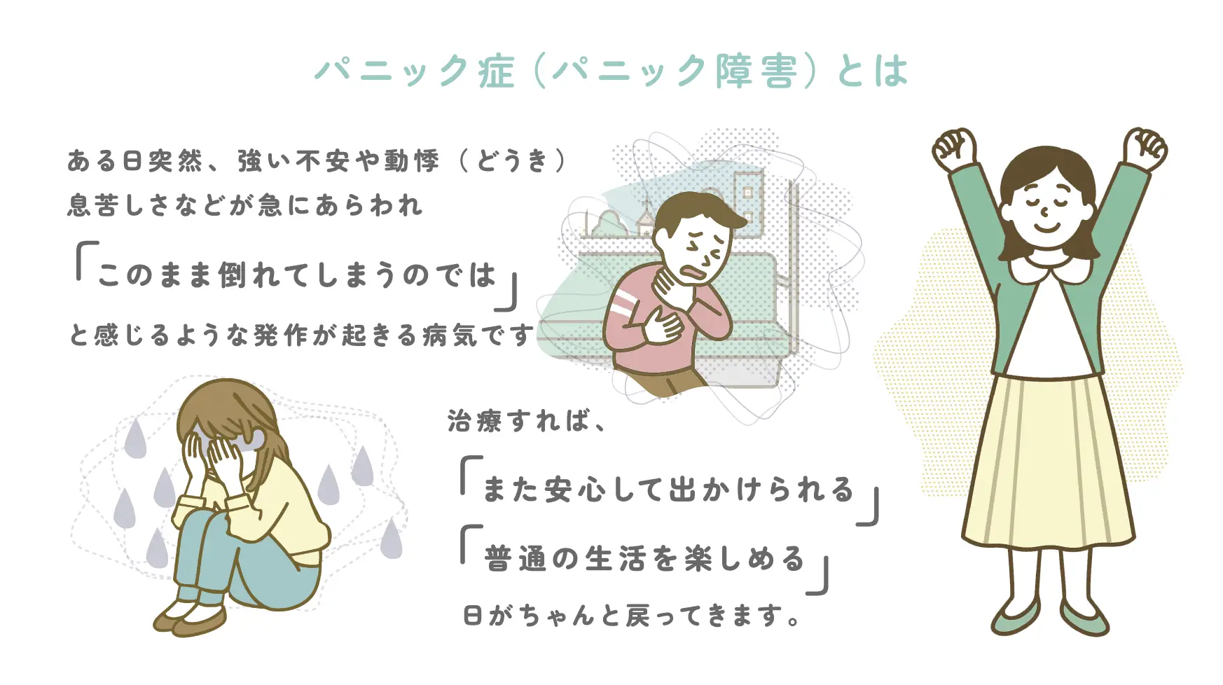 パニック症(パニック障害)とは、ある日突然、強い不安や動悸(どうき)、息苦しさなどが急にあらわれ、「このまま倒れてしまうのでは」と感じるような発作が起きる病気です。