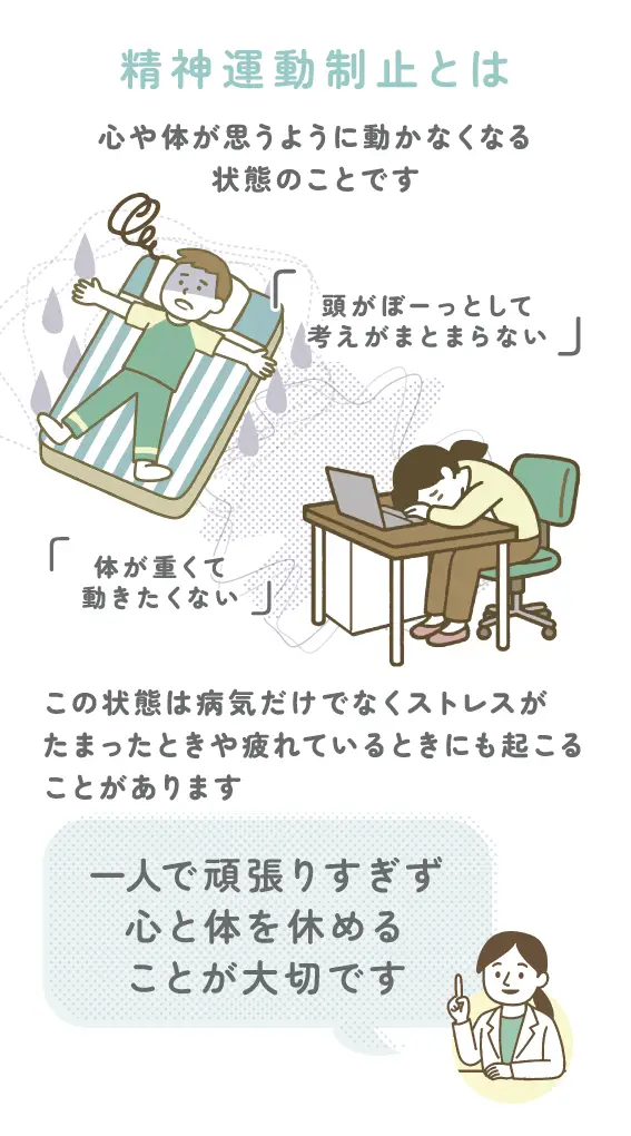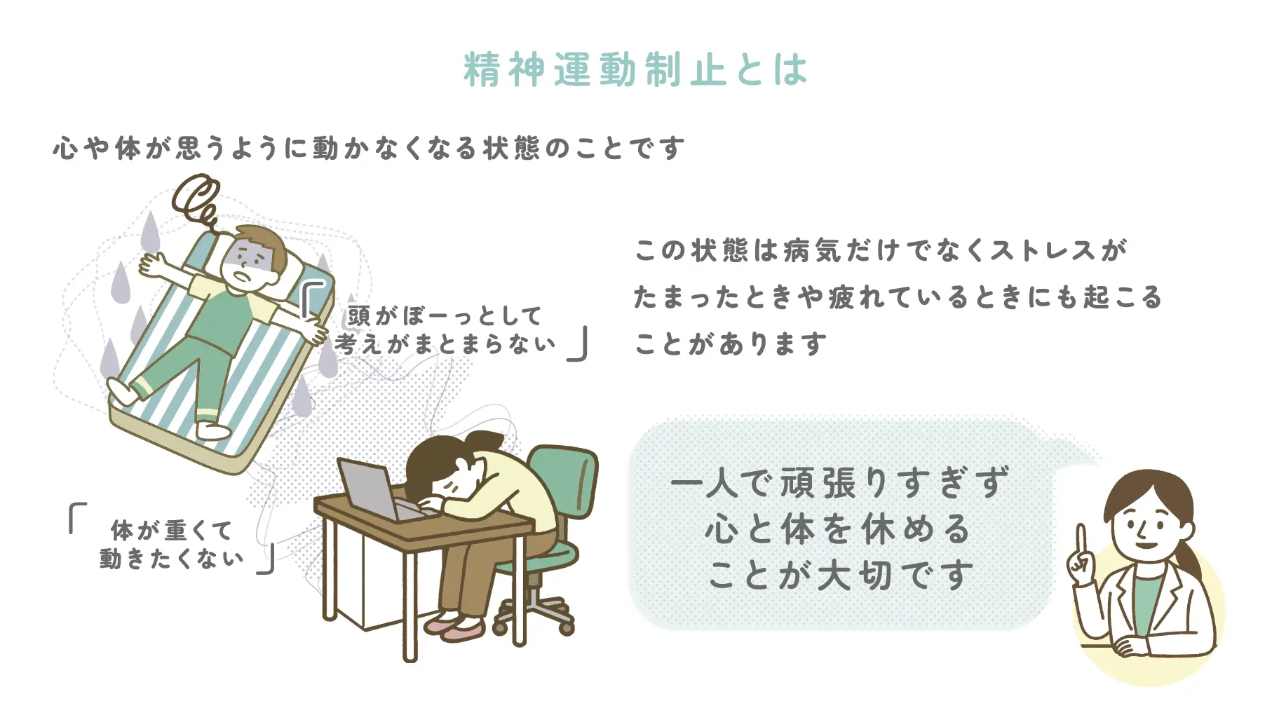 精神運動制止は、心と体が疲れているときに起こりやすい症状で、「動けない」「動きが遅くなる」といった形で現れます。