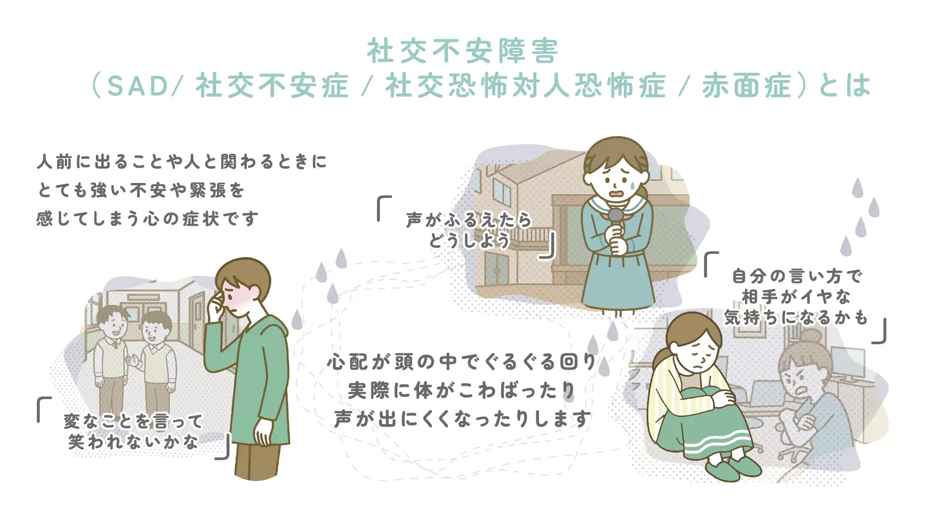 社交不安症(しゃこうふあんしょう)は、人前に出ることや人と関わるときに、とても強い不安や緊張を感じてしまう心の症状です。