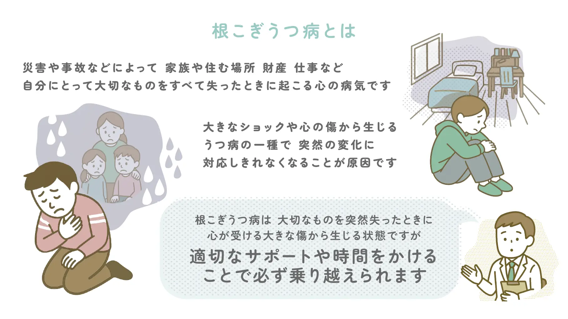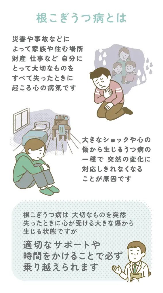 根こぎうつ病とは、災害や事故などによって、家族や住む場所、財産、仕事など、自分にとって大切なものをすべて失ったときに起こる心の病気です。