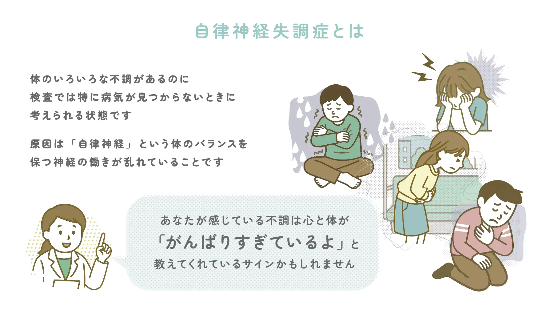 自律神経失調症(じりつしんけいしっちょうしょう)は、体のいろいろな不調があるのに、検査では特に病気が見つからないときに考えられる状態です。