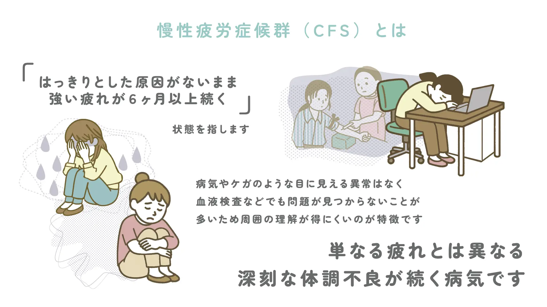 慢性疲労症候群(CFS)は、「はっきりとした原因がないまま、強い疲れが6ヶ月以上続く」状態を指します。