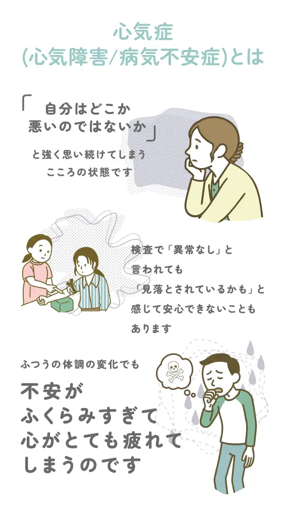 病気不安症(びょうきふあんしょう)は、「自分はどこか悪いのではないか」と強く思い続けてしまうこころの状態です。