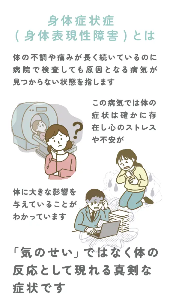 身体症状症は、体の症状があっても原因がわからず、不安やストレスが深く関係している病気です。