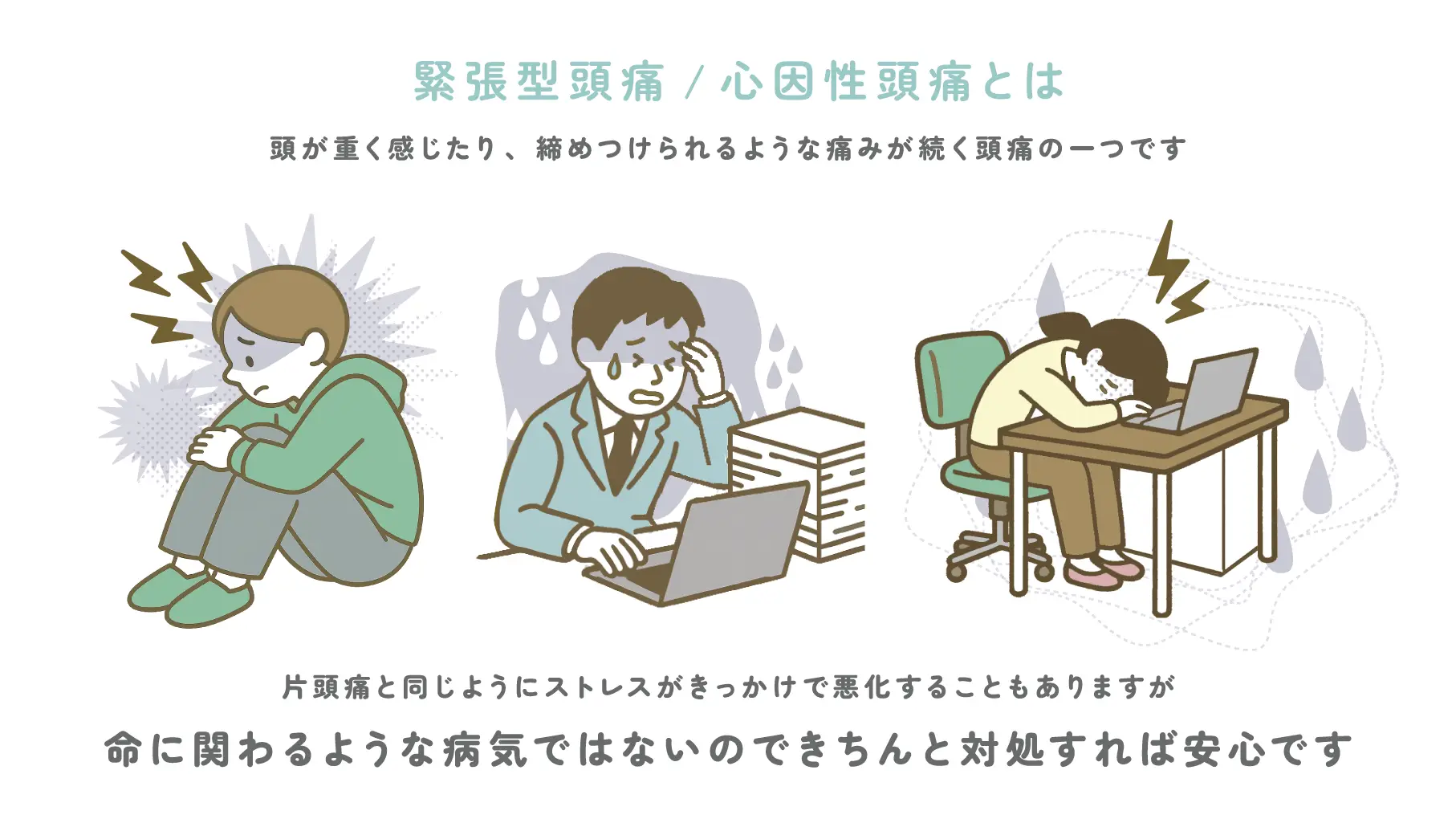 「ストレス頭痛」とも呼ばれていたことがあり、心の緊張やストレスと深く関係しています。