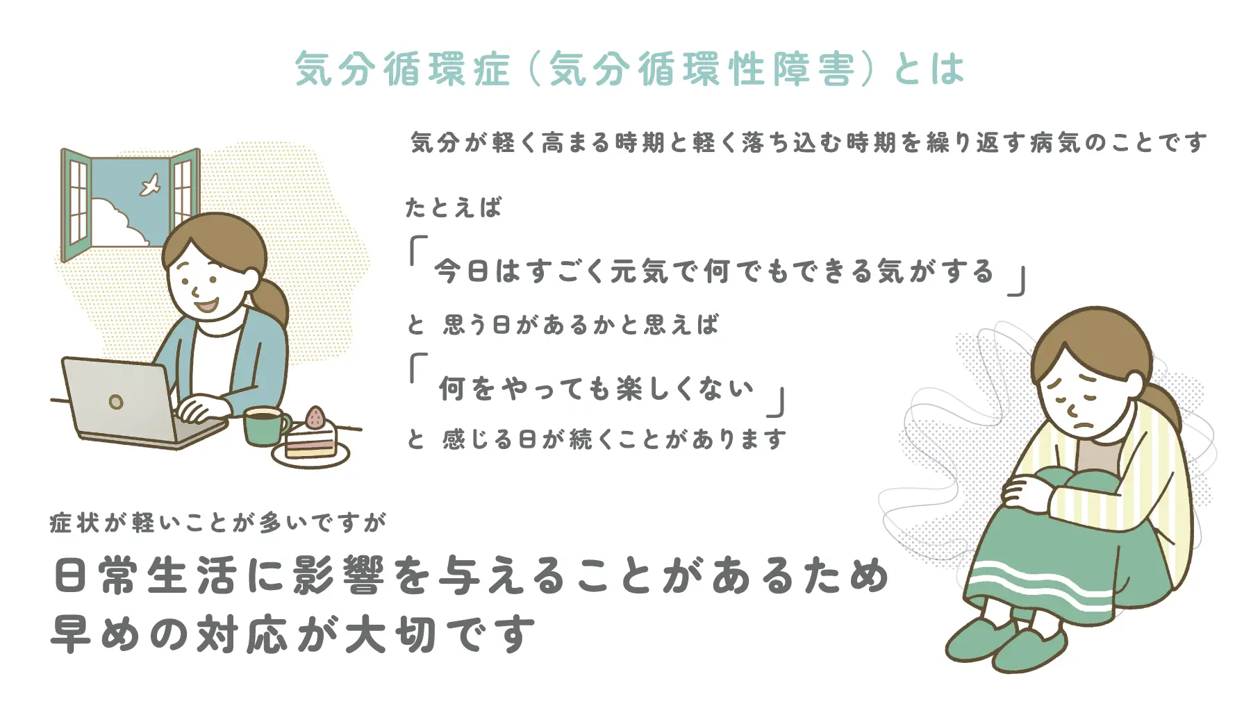 このような気分の波が2年以上続くと気分循環症と診断されます。