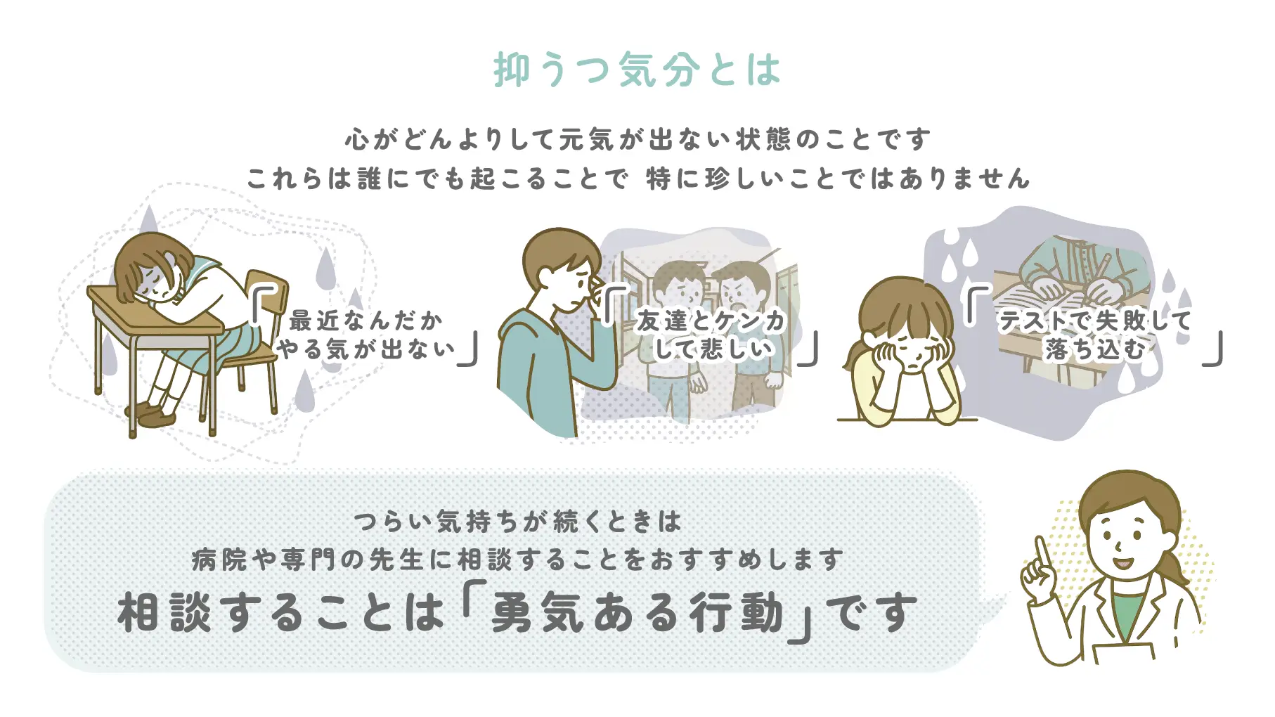 たとえば、テストで思うような点数が取れなかったり、友達とケンカをしたりするときに、「悲しい」「落ち込む」と思うことがあります。これが抑うつ気分です。