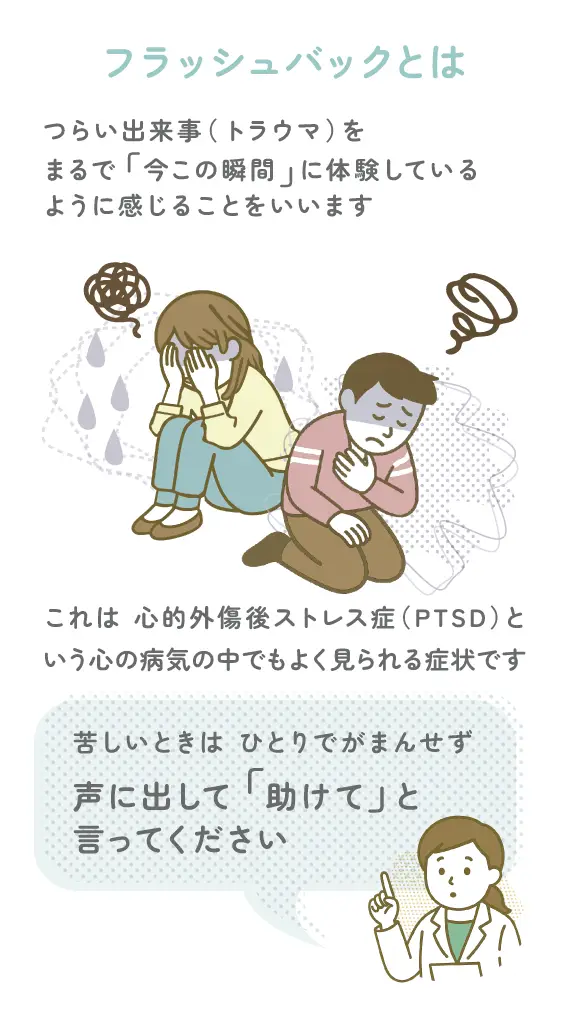 フラッシュバックとは、つらい出来事(トラウマ)を、まるで「今この瞬間」に体験しているように感じることをいいます。