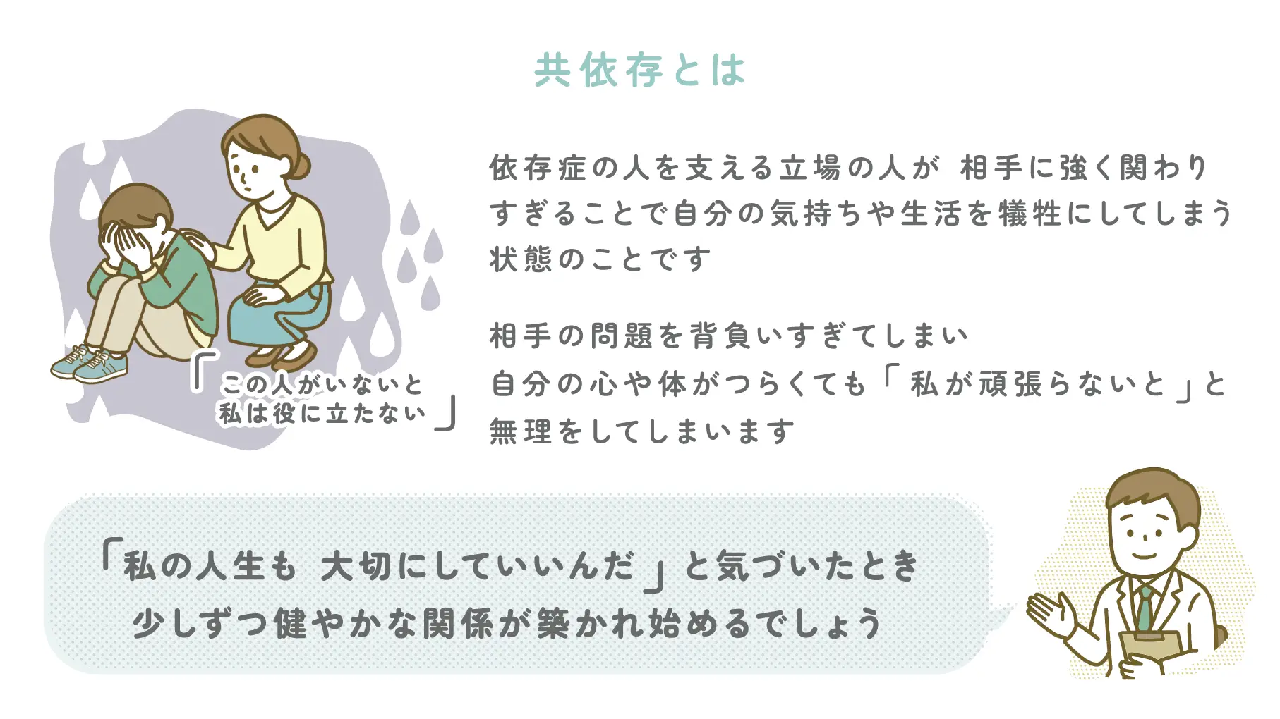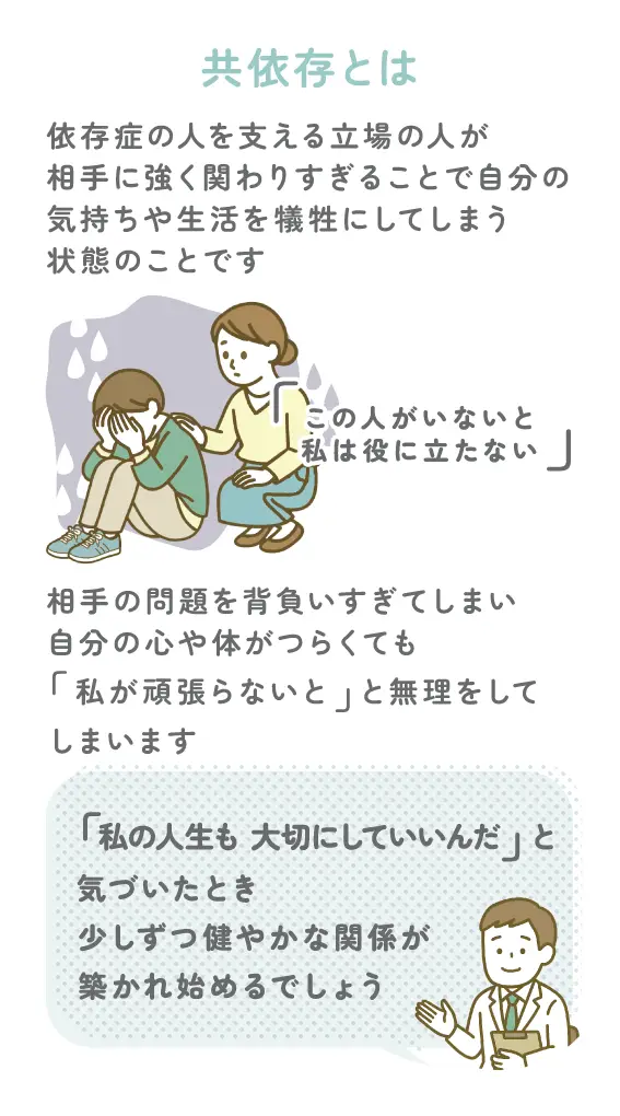 共依存とは、依存症の人を支える立場の人が、相手に強く関わりすぎることで、自分の気持ちや生活を犠牲にしてしまう状態のことを指します。たとえば、アルコール依存症の家族が飲酒をやめないのに、会社に連絡して言い訳をしたり、掃除や後始末をすべて担ってしまう場合などです。「助けたい」「守りたい」という思いから始まる関係ですが、結果として相手の回復を妨げてしまうこともあるため、注意が必要です。