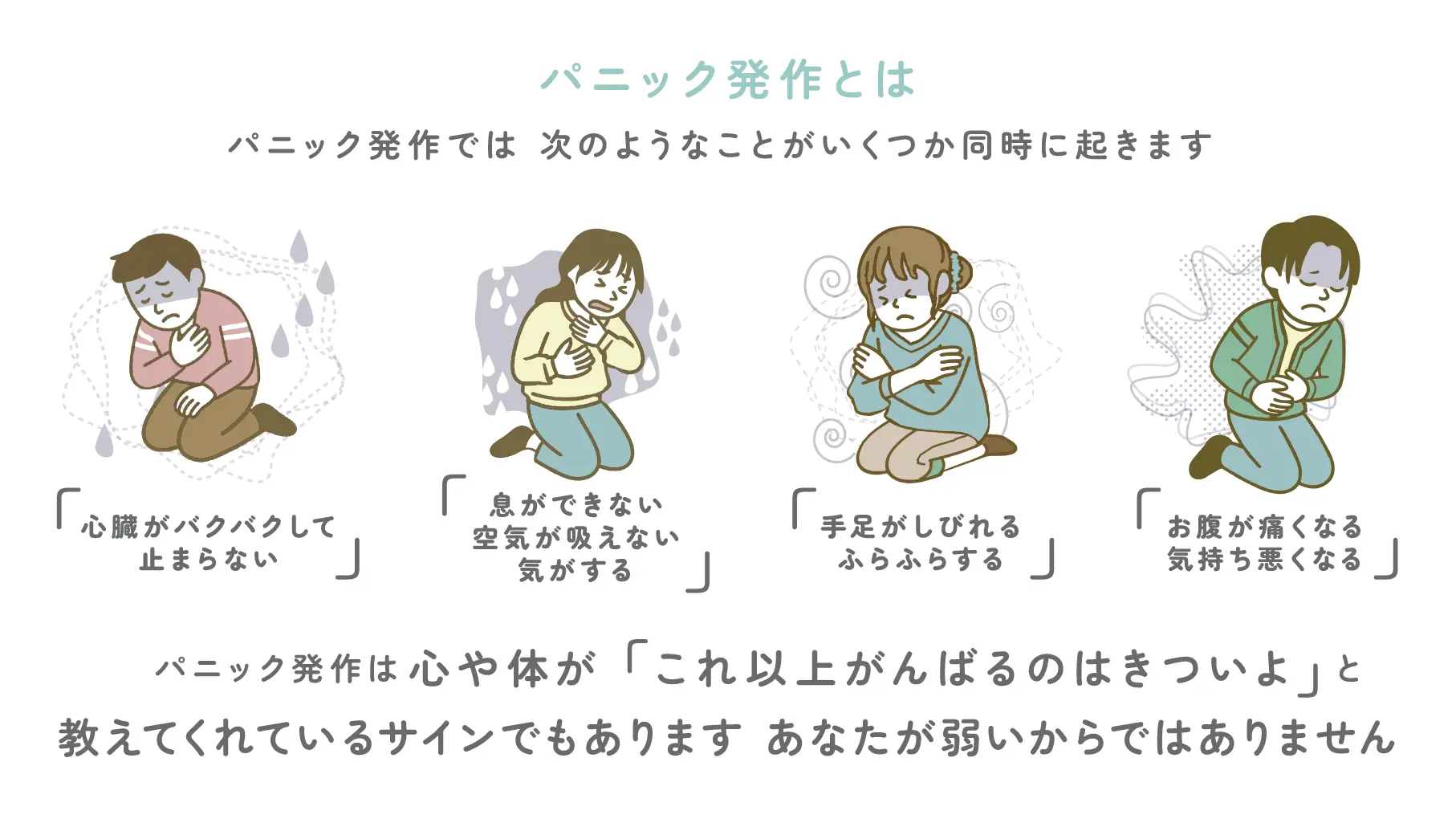また、パニック発作は心や体が「これ以上がんばるのはきついよ」と教えてくれているサインでもあります。