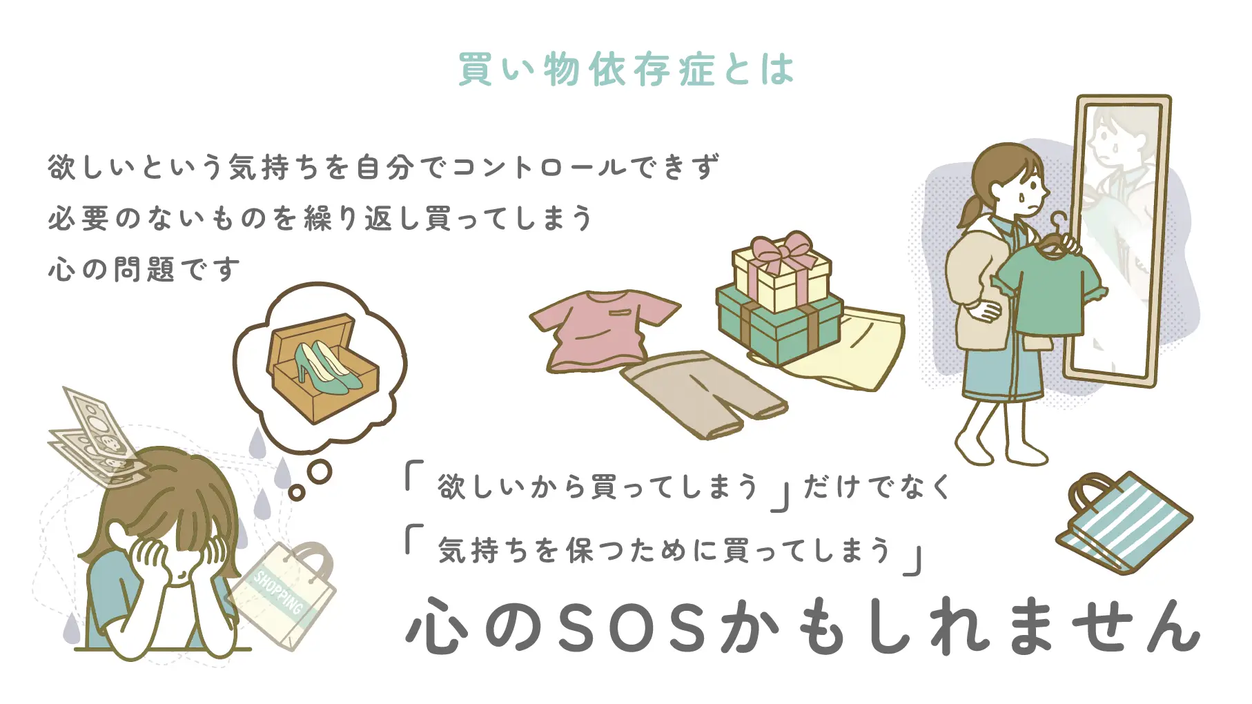 買い物依存症とは、欲しいという気持ちを自分でコントロールできず、必要のないものを繰り返し買ってしまう心の問題です。