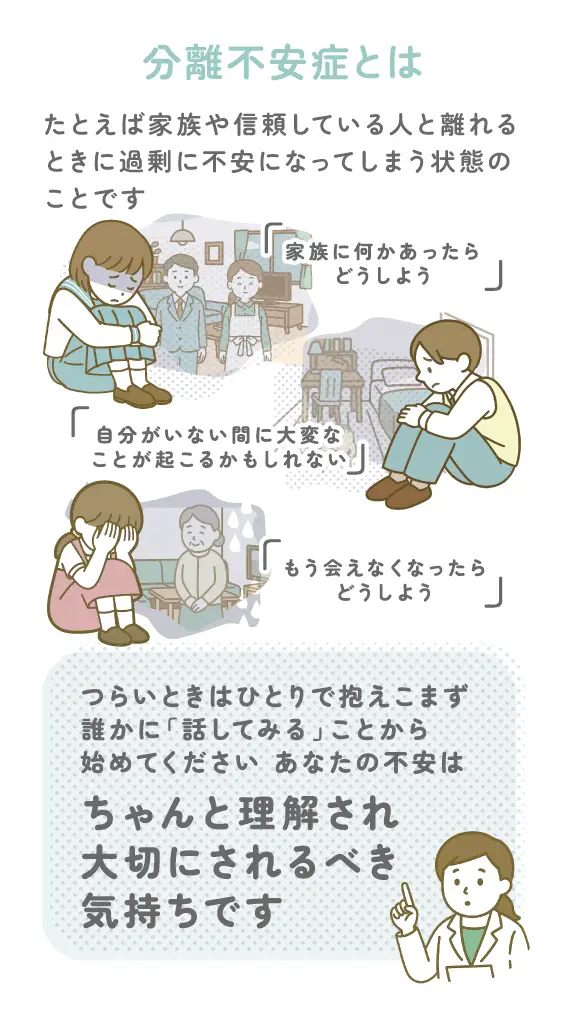 分離不安症(ぶんりふあんしょう)は、親や家族、信頼している人と離れることに強い不安を感じてしまう心の状態です。