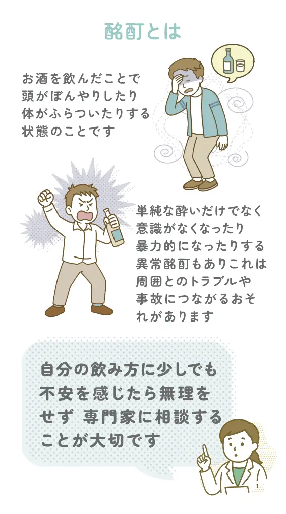 単純な酔いだけでなく、意識がなくなったり暴力的になったりする異常酩酊もあり、これは周囲とのトラブルや事故につながるおそれがあります。
