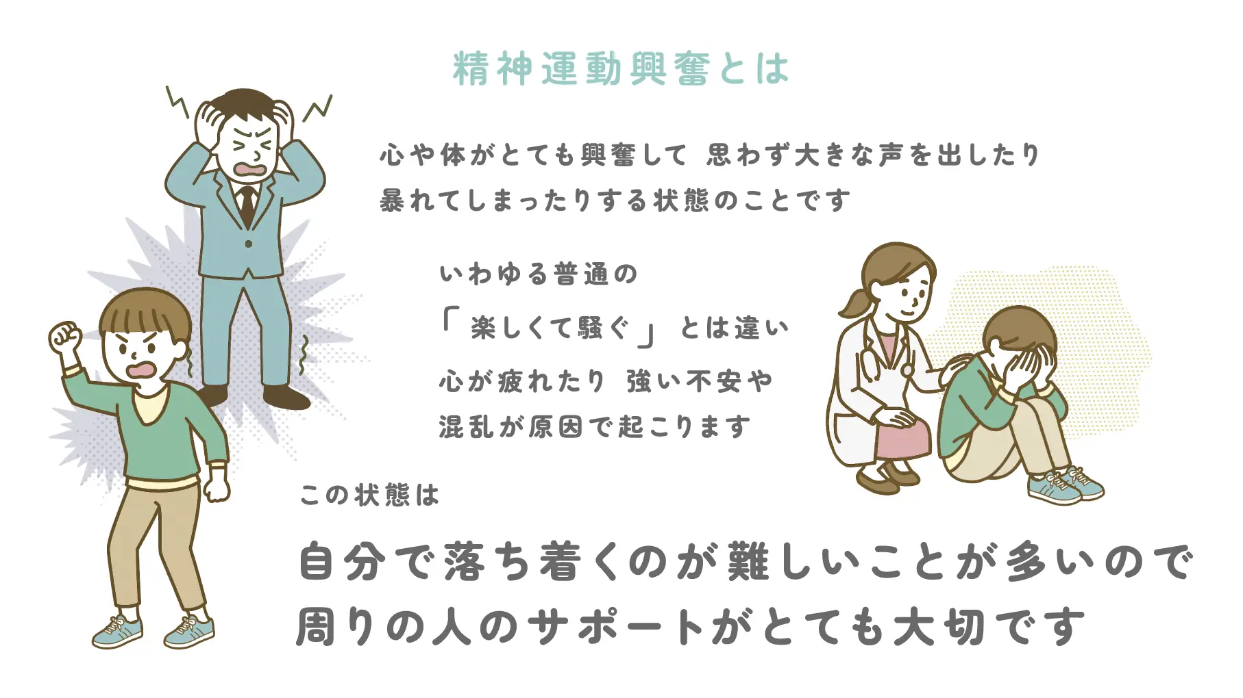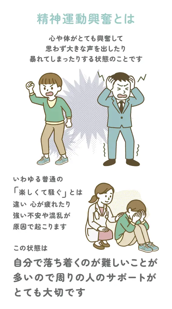精神運動興奮とは、心や体がとても興奮して、思わず大きな声を出したり、暴れてしまったりする状態のことです。