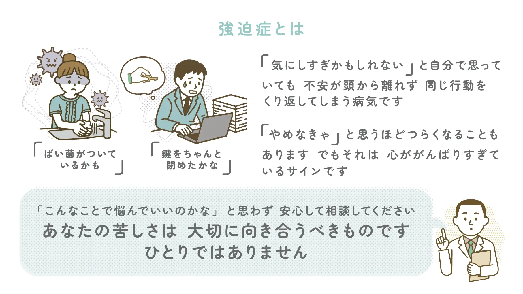 強迫症(きょうはくしょう)とは、「気にしすぎかもしれない」と自分で思っていても、不安が頭から離れず、同じ行動をくり返してしまう病気です。
