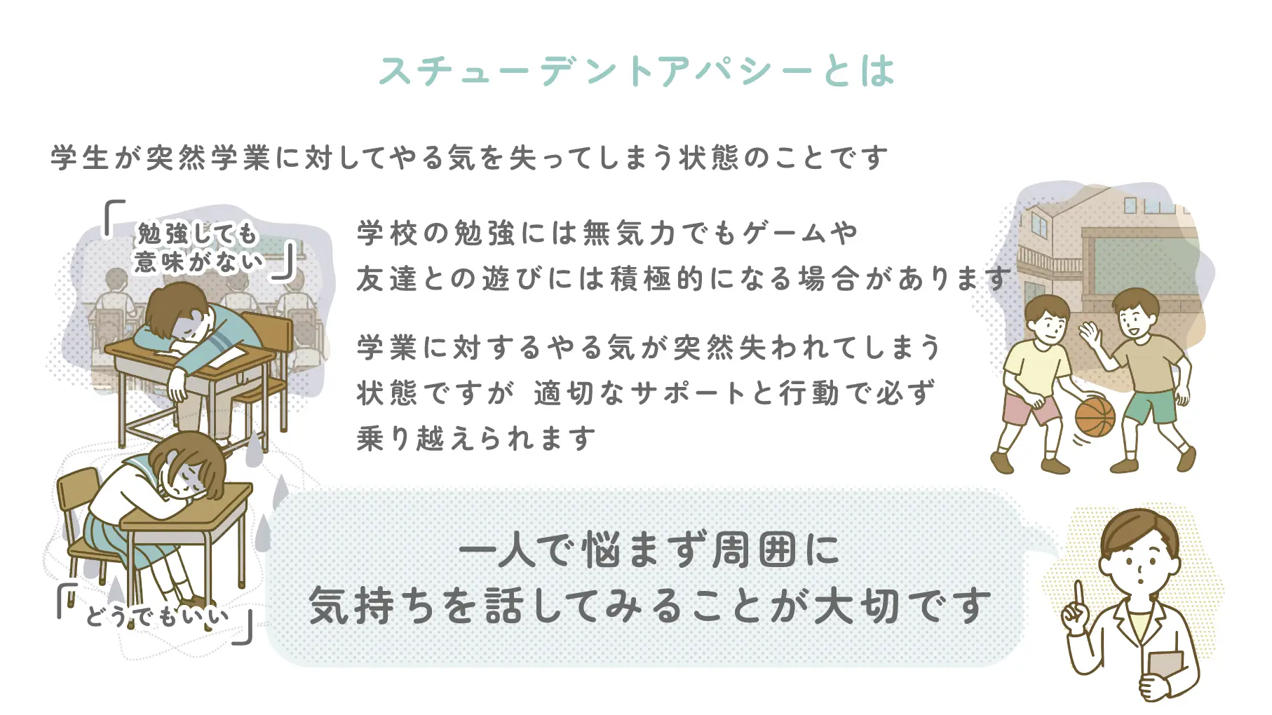 スチューデントアパシーとは、学生が突然学業に対してやる気を失ってしまう状態のことです。