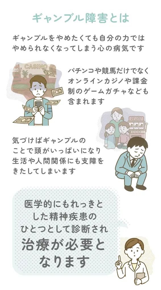 ギャンブル障害とは、ギャンブルをやめたくても自分の力ではやめられなくなってしまう心の病気です。