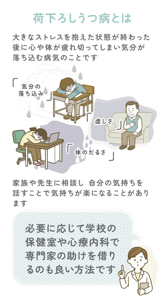 荷下ろしうつ病とは、大きなストレスを抱えた状態が終わった後に心や体が疲れ切ってしまい、気分が落ち込む病気のことです。
