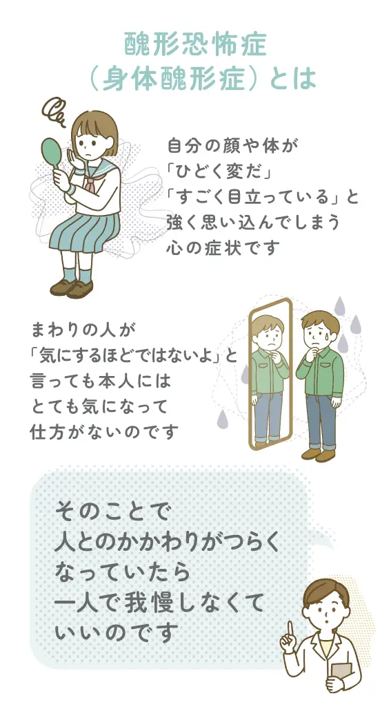 醜形恐怖症(しゅうけいきょうふしょう)や身体醜形症(しんたいしゅうけいしょう)とは、自分の顔や体が「ひどく変だ」「すごく目立っている」と強く思い込んでしまう心の症状です。