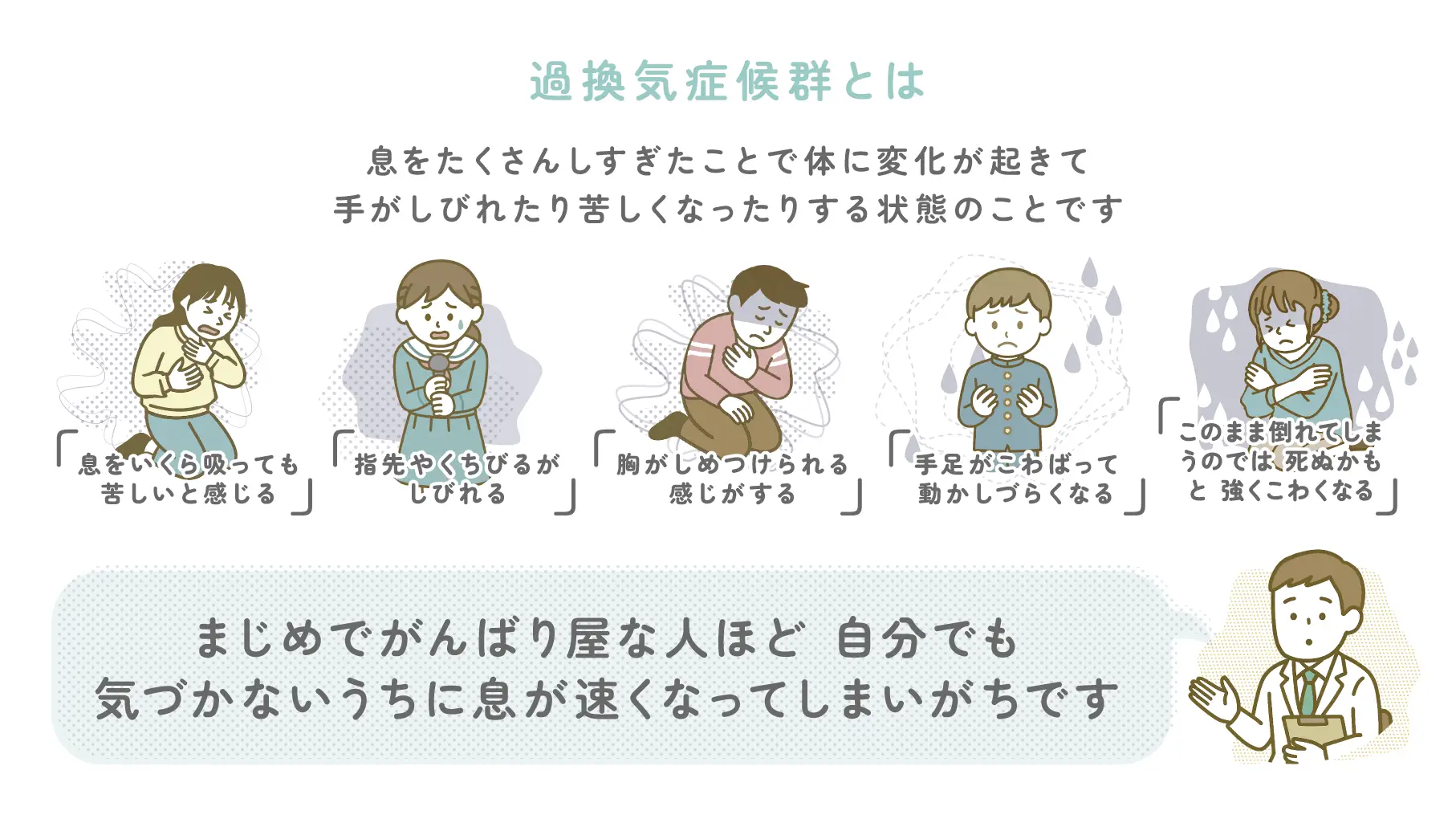 過換気症候群は、息をしすぎてしまうことで体にしびれや苦しさが出てくる症状です。