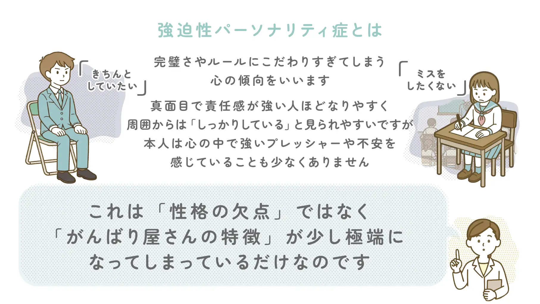 強迫性パーソナリティ症とは、「きちんとしていたい」「ミスをしたくない」という気持ちがとても強く、完璧さやルールにこだわりすぎてしまう心の傾向をいいます。